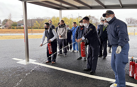 消火訓練では、実際の消火器を使用し、火災発生時に迅速かつ安全に初期消火が行えるよう、消火器の使い方や注意点を確認しながら訓練を行いました。